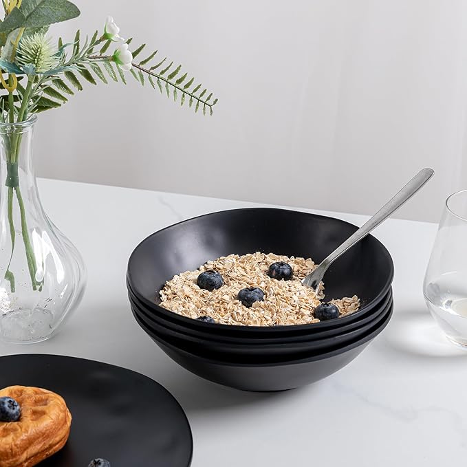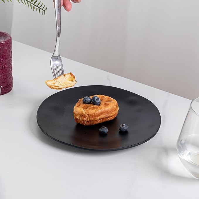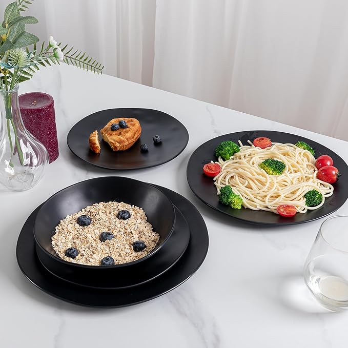 - MATTE BLACK DINNERWARE SET:This melamine dinnerware set features elegant, natural matte black stone smooth feel that echos the looks of organic stoneware,this collection of durable melamine that's primed for alfresco entertaining, bring the dinner party to the outdoor with our melamine dinnerware