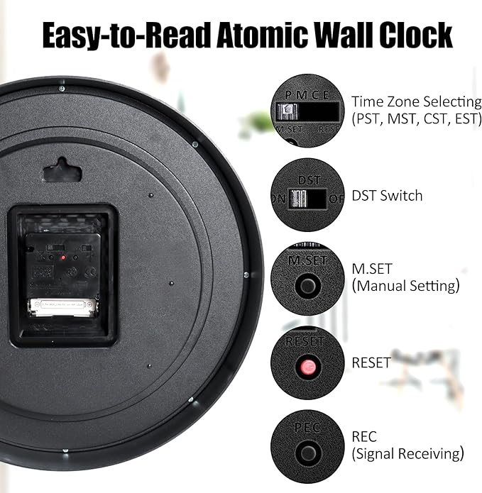 - [Atomic Wall Clocks Battery Operated] Powered by 1 AA alkaline (included), this self setting clock will receive longer and more stable power. In addition, the movement of the atomic kitchen wall clock is equipped with a with a lightweight cover, which can prevent dust from entering the movement and affecting its operation. The service life of the clock will be greatly extended.