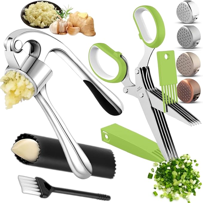 - ??WORRY-FREE GUARANTEE: We stand by the quality of our products, offering a hassle-free, LIFETIME WARRANTY. Make cooking a joy with our garlic press stainless steel and 5 Blade Herb Scissors for Kitchen set!