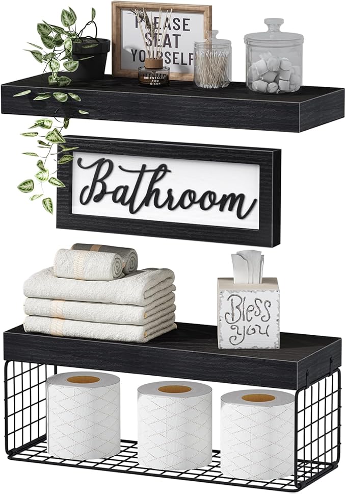 - Patent Design: Create a farmhouse oasis in your bathroom with decor sets! Includes 2 floating shelves, 1 basket, and 1 decorative sign