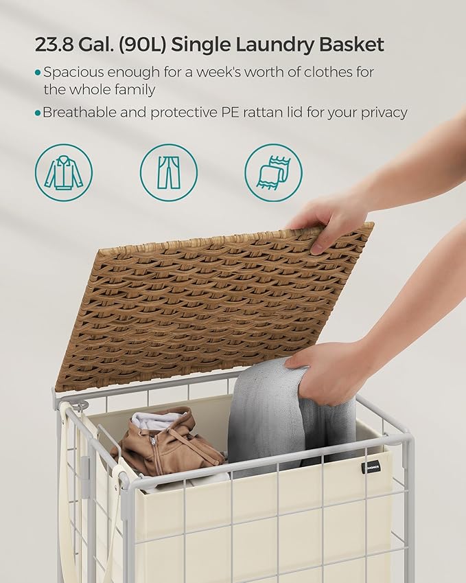 - [Stylish and Sturdy Lid] The PE rattan lid of this laundry rack, designed in a chic boho style, not only protects your privacy but also adds a natural touch to your home decor. It holds up to 11 lb and is perfect for storing handy items like towels