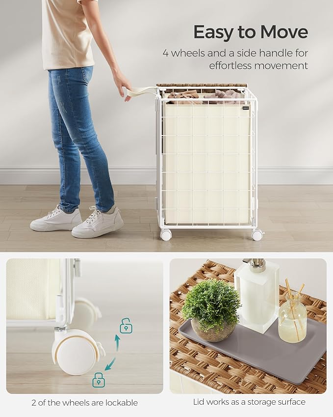 SONGMICS Laundry Hamper, 90L Laundry Basket with Lid, Clothes Hamper with Wheels, Collapsible Removable Liner Bag, Iron-Made Laundry Sorter, Natural Beige and Cream White ULCB290N01