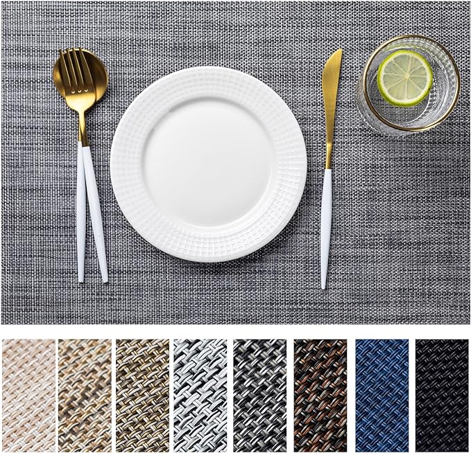 LEXMORE Placemats Set of 8 Vinyl/Plastic Woven Place Mats for Kitchen Table Indoor/Outdoor Washable Placemat Wipeable Dining Table Mats(Dark Gray)