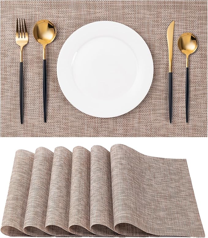 Placemats Set of 6 Washable Indoor/Outdoor Vinyl Place Mats for Dining Table Durable Non-Slip Heat Resistant PVC Weave Table Mats(Khaki)