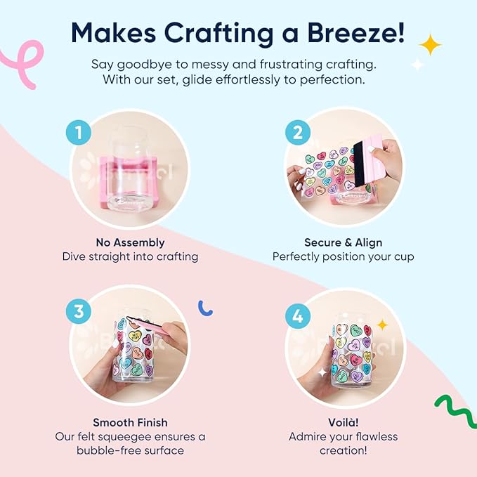 - Easy to Use: The steps of making crafts by using cup cradle set is simple:1. Place the prepared tumblers horizontally or vertically on the cradle. 2. Align the decals in correct position. 3.Squeeze out the air bubbles by attached felt squeeze. 4. Your DIY project is finishesd!