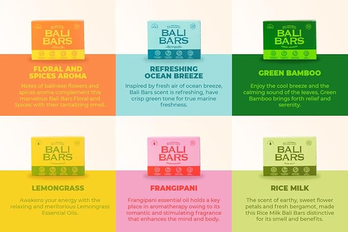 - DELIGHTFUL SENSE PAMPERING EXPERIENCE: Each pack includes 6 x luxurious handmade soap bars with a variety of tropical scents and herbs that will awaken your senses. Comes with Balinese Resorts and Spa signature smell from Lemongrass, Frangipani, Green Bamboo, Refreshing Ocean Breeze, Floral and Spices, and Rice Milk.