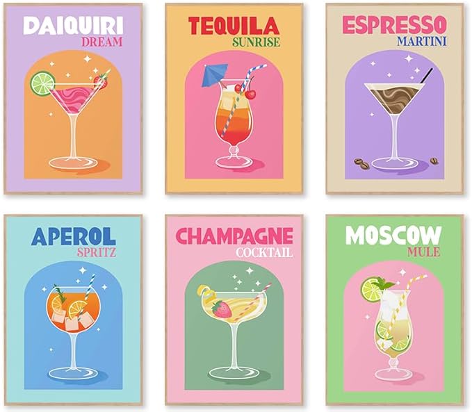 - 【Retro Cocktail Poster】The size of the vintage cocktail wall art prints is: 8x10inch (20x25cmx6pcs). This set of 6 retro cocktail posters adds a touch of vintage charm to your space, featuring funny alcohol wine glass print paintings that bring a lively and playful atmosphere.