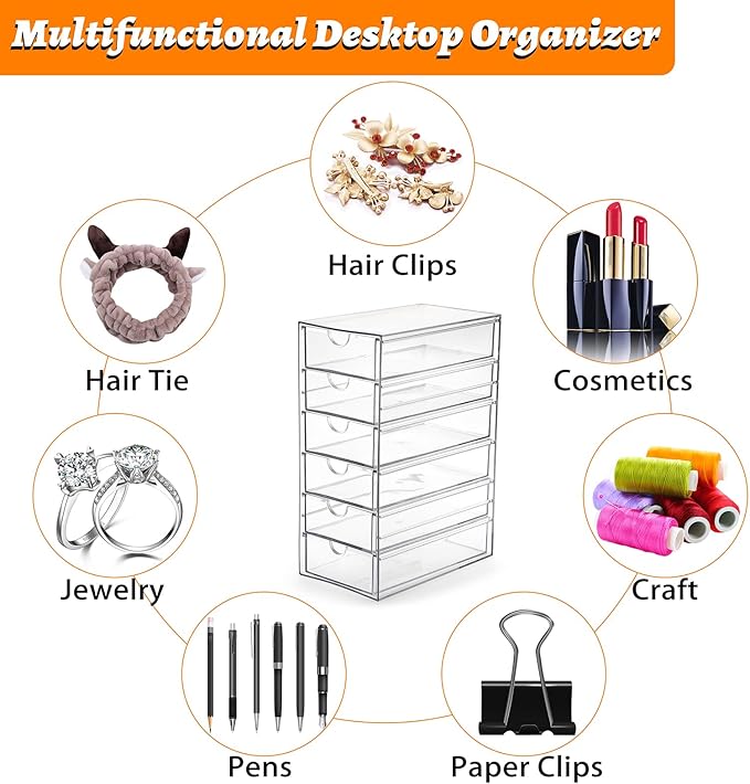 - Large Capacity: Each drawer provide sufficient capacity to accommodate small items such as jewelry, hair ties, hair clips, makeup pads, cotton balls, cosmetics, stationery, office supplies small crafts, etc