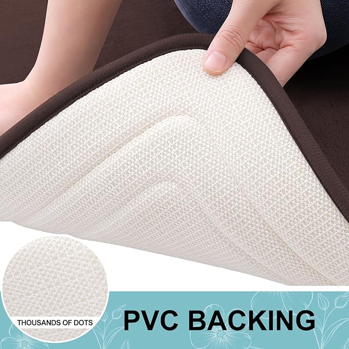 - [STABLE FOOTING] Our bathroom mat is equipped with a robust and enduring PVC backing, preventing shifting and skidding. Unlike mats with rubber backing that may wear off after washing, our bath mat ensures lasting durability. For a secure footing, keep the floor beneath the rug dry and avoid placing it on wet surfaces.