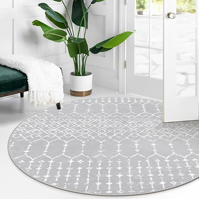 Lahome Moroccan Washable Round Rug - 4Ft Round Area Rugs for Bedroom Non-Slip Grey Stain Resistant Round Kitchen Rug, Modern Geometric Print Indoor Floor Circle Carpet for Entryway Living Room Sofa