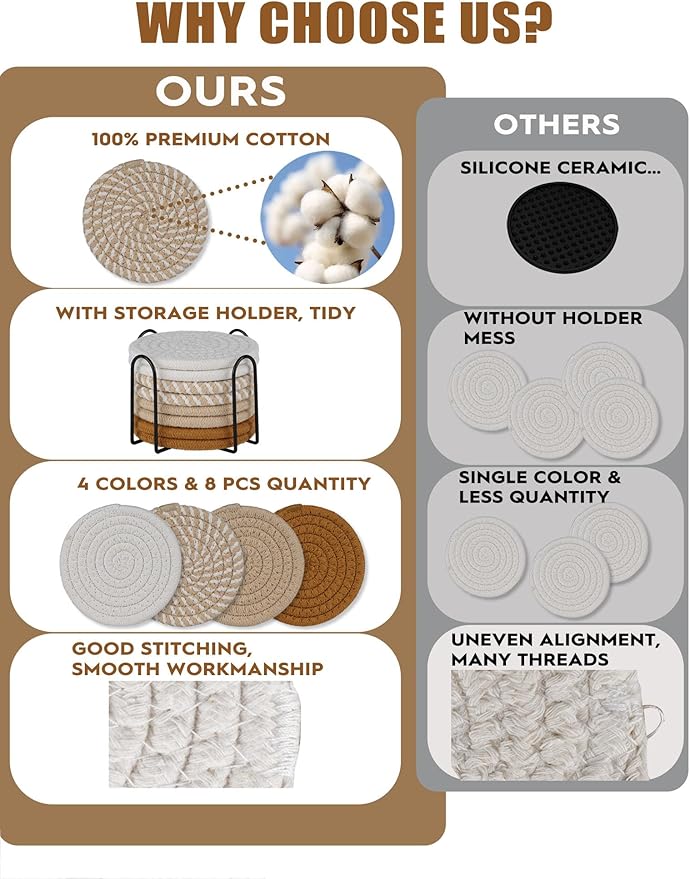 - Protecting Your Tabletops & Noise-Free: These boho coasters are so soft, don't need worry about them scratching furniture. These absorbent coasters doesn't make much noise when placing the cups on the table as well.The coasters for coffee table also are super heat-insulated, ensuring no hot water marks are left on your table when enjoying hot drinks. These heat-resistant coasters can effectively protect your furniture, coffee tabletops and countertops.