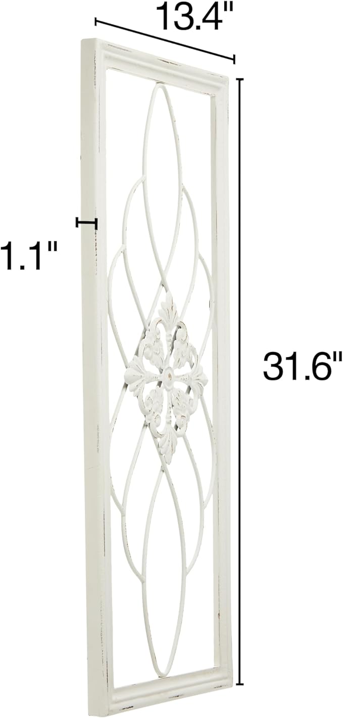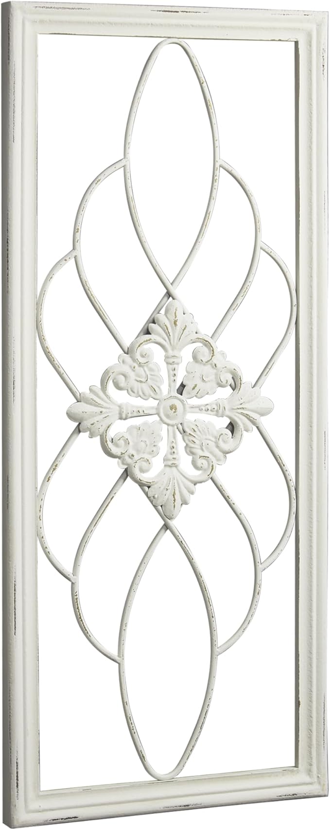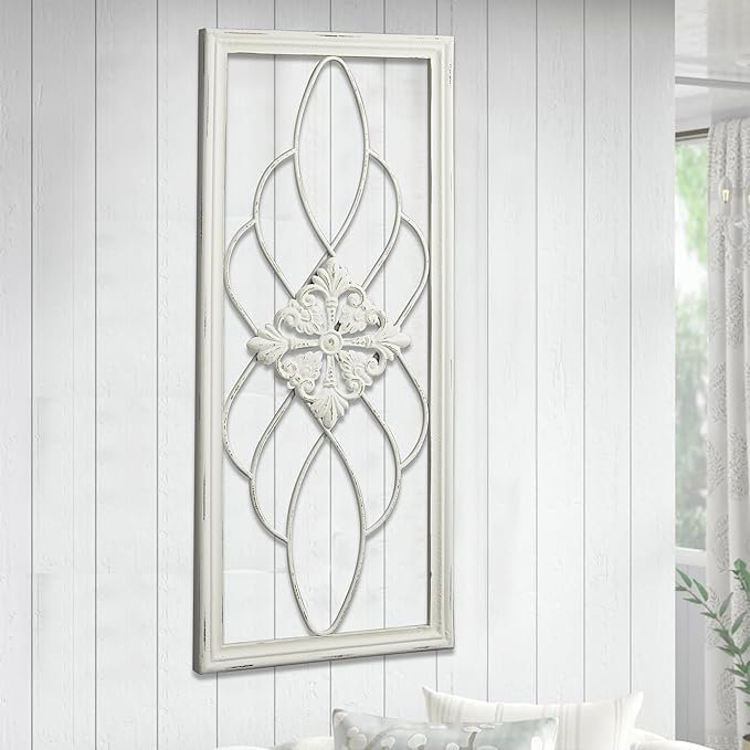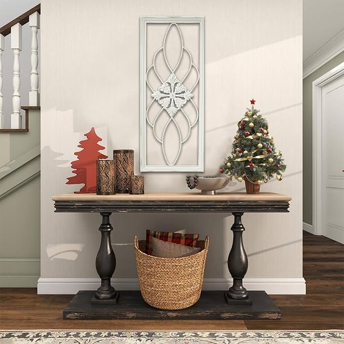 - [RUSTIC WOOD AND METAL SCROLL] The rustic appeal of this wall art is enhanced by the combination of distressed whitewashed border and wrought iron, creating a vintage appeal. Whether placed in a farmhouse living room, bedroom or hallway, this unique decor will add timeless character and elegance to your home.