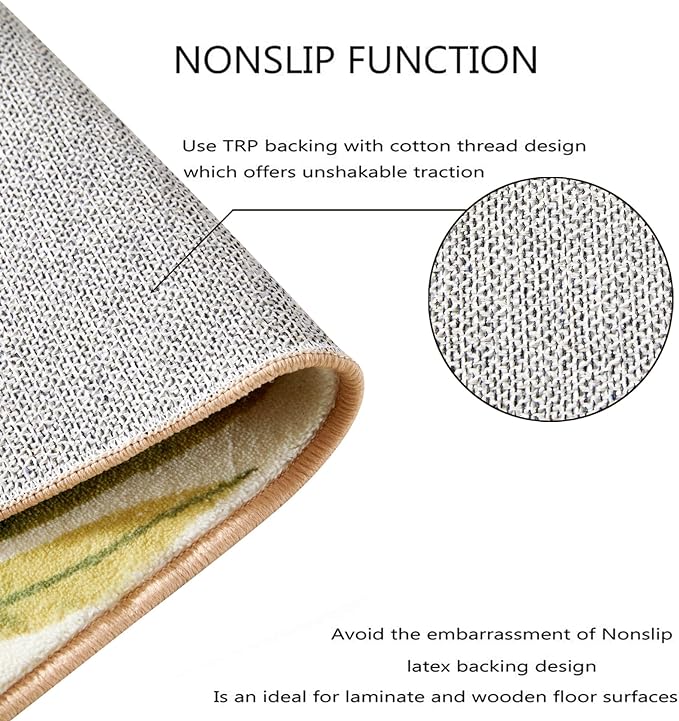 - [NON SLIP TPR BACKING] -- The non-slip TPR backing prevents slipping, tripping and holds the aesthetic accent rug more firmly in place. This neutral rug used upgraded material makes mat odor-free and protect your floors from moisture and scratches