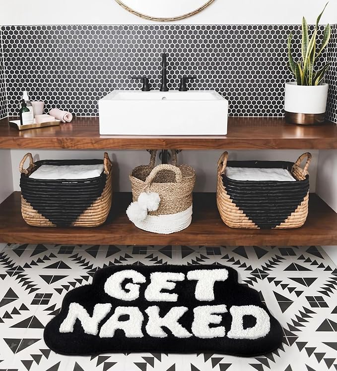- โฉ๐ฉ๐ฒ๐ฟ๐๐ฎ๐๐ถ๐น๐ถ๐๐ ๐ถ๐ป ๐ฆ๐๐๐น๐ฒ: Elevate your bathroom aesthetic with the bold design of our get naked bath mat. Its unique shape and cheeky lettering make it a stylish focal point, perfect for bathrooms, bedrooms, or any space in need of a touch of charm and comfort. It's a trendy bath mat that fits with any modern, rustic, minimalist, boho, or farmhouse bath decor.