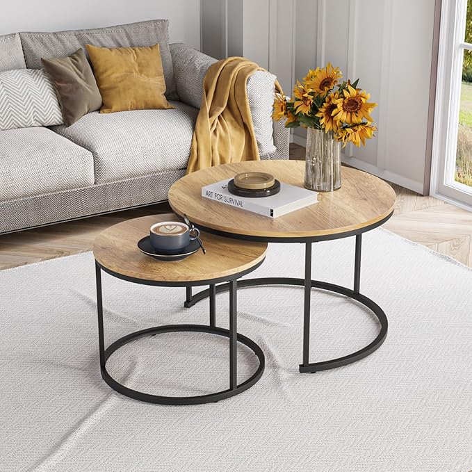 Smuxee Nesting Coffee Table Set of 2, 27.6" Round Coffee Table Wood Grain Top with Adjustable Non-Slip Feet, Industrial End Table Side Tables for Living Room Bedroom Balcony Yard
