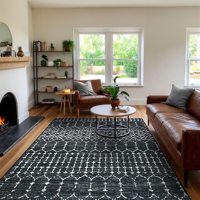 Lahome Moroccan Black Area Rugs 8x10 Living Room - Non-Slip Backing Ultra-Thin Large Rug Throw Stain Resistant Dining Room Rugs for Under Table, Geometric Print Modren Soft Rug for Bedroom Office