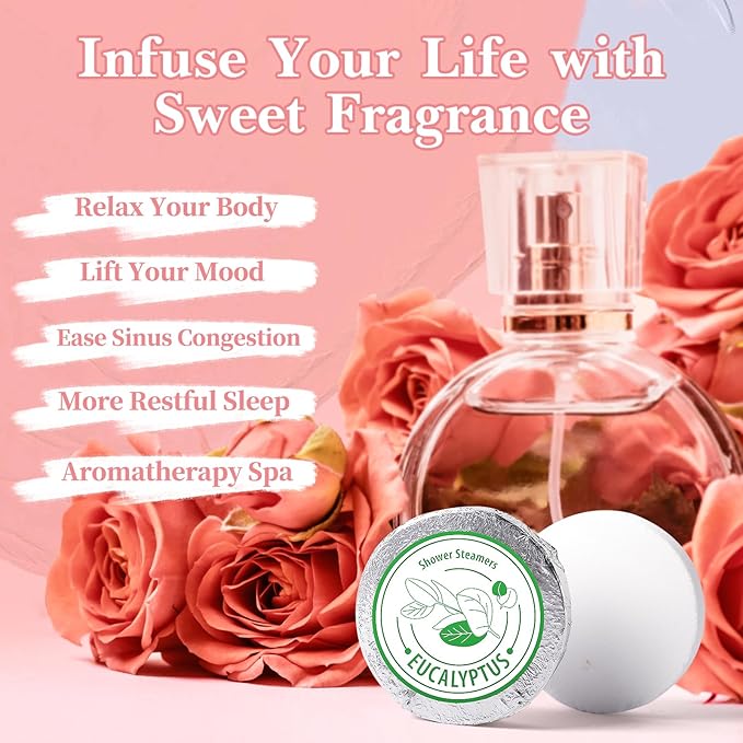 - 【8 AROMATIC SCENTS, LONG-LASTING FRAGRANCE】 Each shower steamer has a unique scent, ranging from Eucalyptus、Lavender、Peppermint、Sweet Orange、Rose、Lemon、Cherry、Vanilla. Different scents have different functions, making you feel refreshed or relaxed. The unique and rich aroma fills the bathroom air, creating a wonderful spa experience at home.