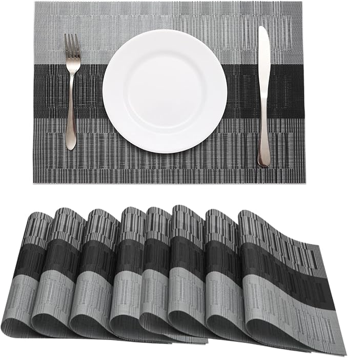 HeloHo Black Grey Stripe Placemats Set of 8, Heat-Resistant Washable Placemats Non-Slip Vinyl Woven Table Mats Wipeable Placemat for Kitchen Dining Table Decoration Indoor Outdoor