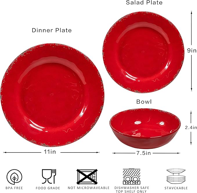 12 Piece Farmhouse Melamine Dinnerware Sets, Service For 4 Rustic Crackled Plates and Bowls Sets, Melamine Dishes Set for Christmas,Wedding, Set of 4 Camping Dishes, Red