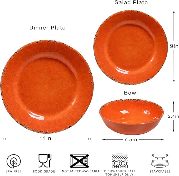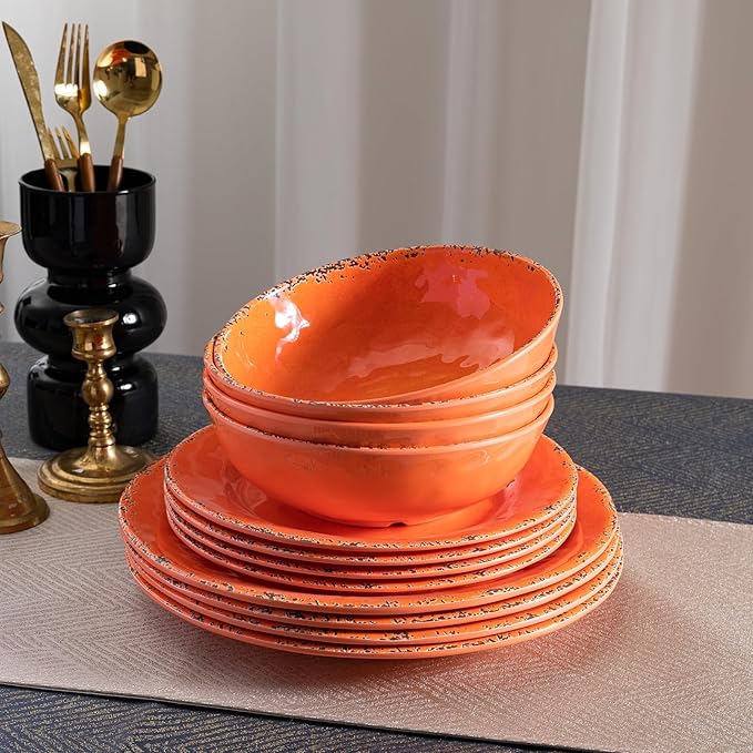 Rustic Melamine Dinnerware Sets, Farmhouse Dishes Set for 4, Lightweight 12 Piece Kitchen Plates and Bowls Set for Indoor and Outdoor Use, Dishwasher Safe, Orange