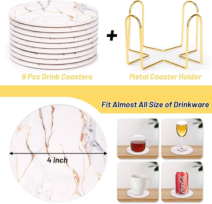 - Package including: Billbotk drink coasters set includes 9 pieces of ceramic coasters and a metal holder. Simple marble design is suitable for home, office and party decorations. The coaster holder makes the coasters convenient for storage.