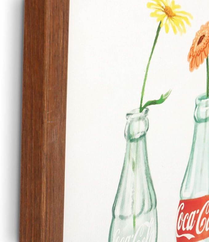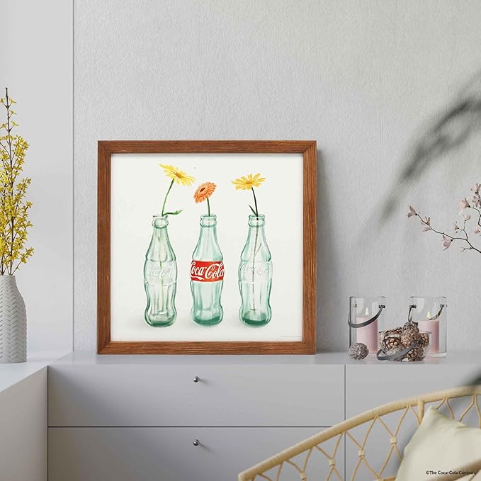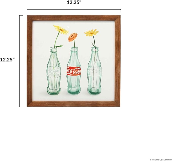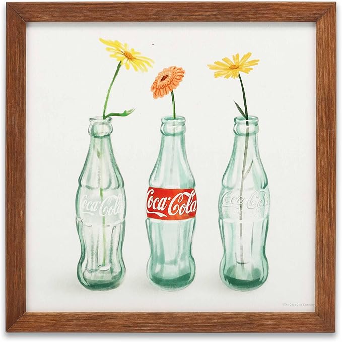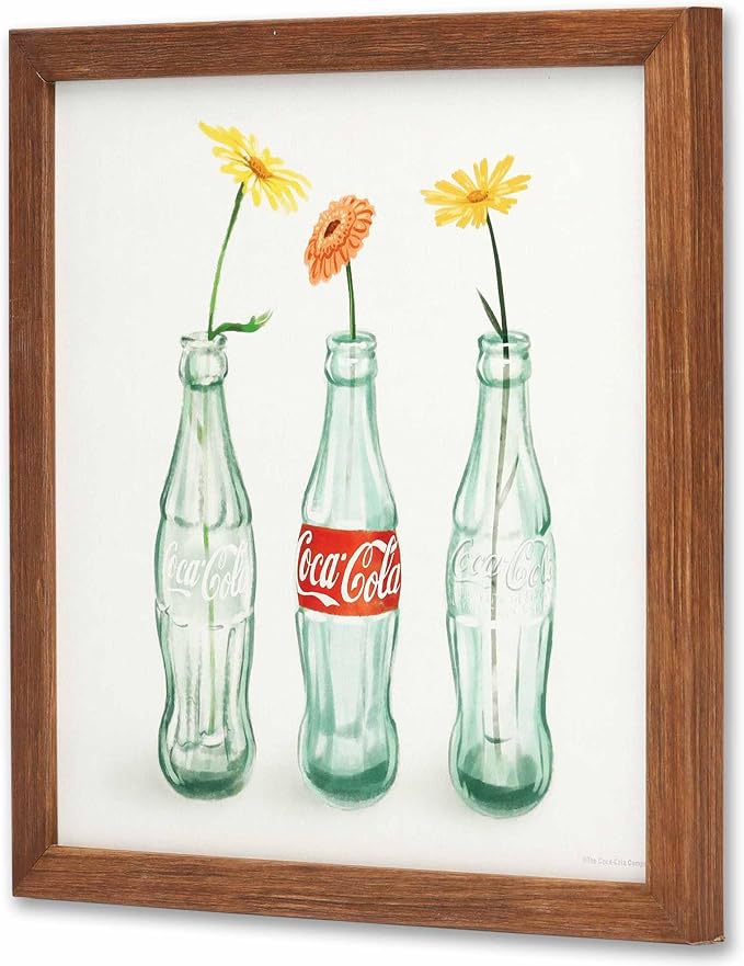 - Framed Wall Decor: Three classic Coca-Cola bottles each house a single flower bloom. Make a sunny and sweet addition to your favorite space with this romantic and retro wall decor!