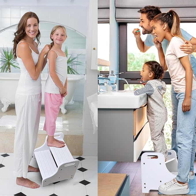Wooden Step Stool for Kid Toddler, Potty Training for Children with 2 Built-in Handle 300lbs Load Capacity, Acacia Foot Stool Helps Your Kid Independently for Brushing, Grabbing Things (White)