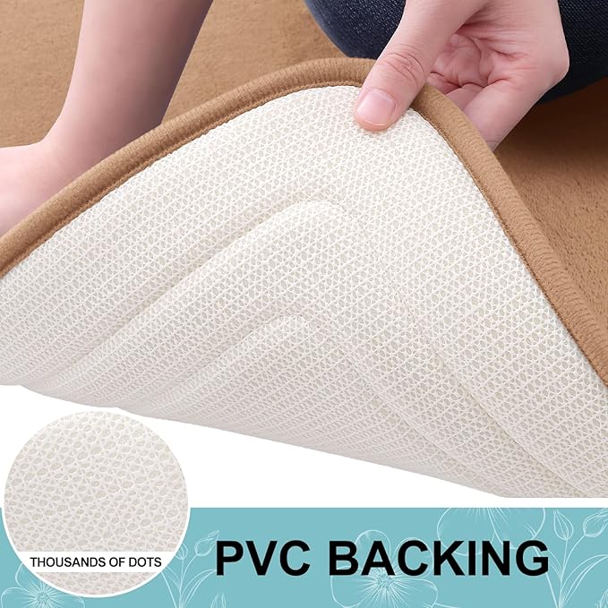 - [STABLE FOOTING] Our bathroom mat is equipped with a robust and enduring PVC backing, preventing shifting and skidding. Unlike mats with rubber backing that may wear off after washing, our bath mat ensures lasting durability. For a secure footing, keep the floor beneath the rug dry and avoid placing it on wet surfaces.