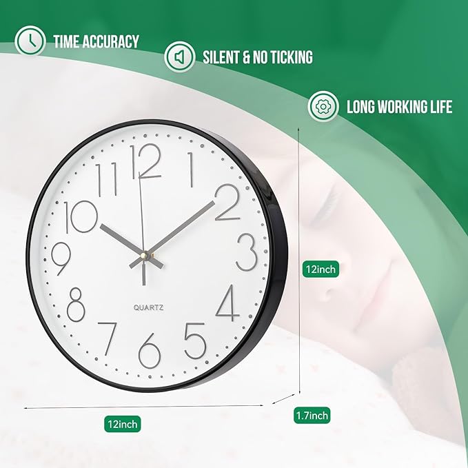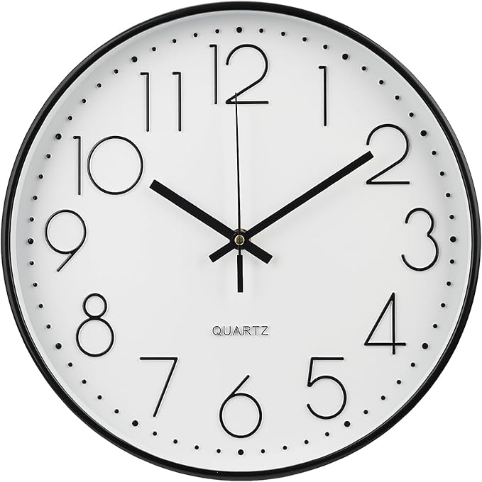 Wall Clock 12 Inch Non-Ticking Silent Modern Simple Style Round Decor Clock Black Stereoscopic Dial Quartz Wall Clocks for Home/Office/School/Living Room/Bedroom/Kitchen