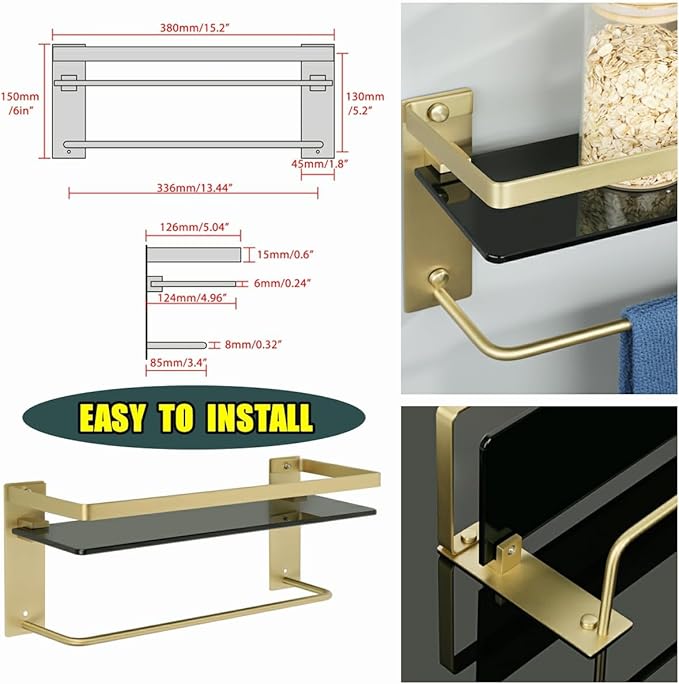 - 【Gold and Black Finish】The glass shelf is finished by black and gold two-color combination, dazzling and beautiful appearance, able to resist daily corrosion and oxidation, suitable for a variety of bathroom styles, it can instant improve the Luxury level for your bathroom.
