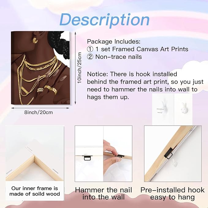 - BUILT-IN FRAME:These prints size is (8 x 10 x 0.4 inch) Built-in frame. Complete with all necessary accessories. With the provided hanging kit,, displaying this African American Woman wall painting is a breeze. infusing a distinctive, personal vibe into your home. We hope that it is not only painting, but also an artwork that lights up your life . And make your house full of wonderful atmosphere.