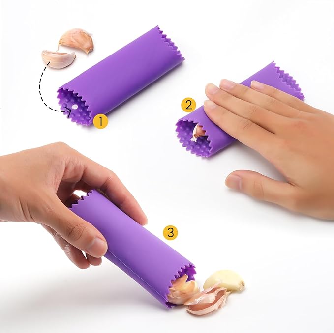 - - Efficient Garlic Press Set: Our garlic mincer contains 59 small holes for efficient extraction of garlic paste. The garlic press set includes a silicone garlic peeler to minimize direct contact with the cloves. Insert one clove of garlic and roll the tube on the countertop and the garlic skin will be removed instantly