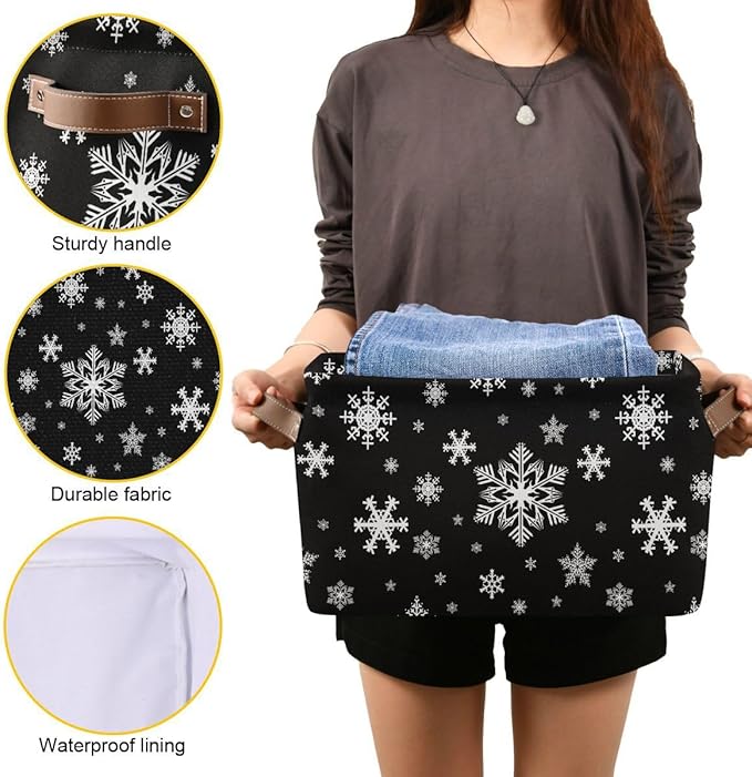 Winter Snowflake Black Storage Basket Fabric Kitchen Baskets Christmas Holiday Open Home Storage Bins Boxes Foldable Organizer Bag for Baby Cloth Xmas Baskets 16×12×8 Inches