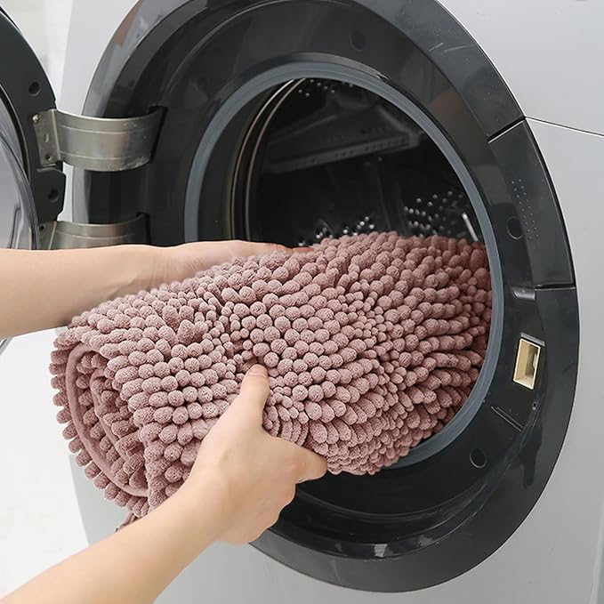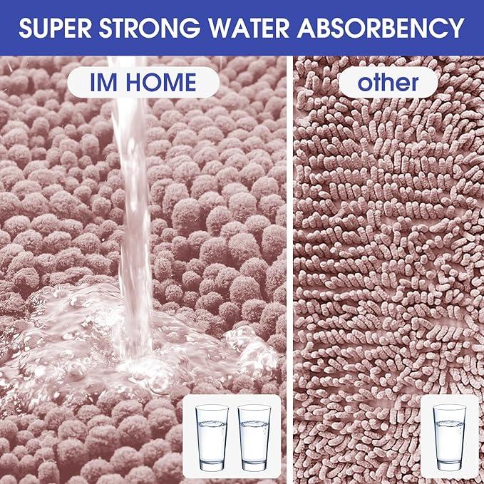 - SUPERIOR ABSORBENCY: The bold pile chenille on the top surface of the luxurious toilet mat soak up a lot of water and keep your floor dry when you're stepping out of the bath, Bathtub, shower, or getting ready by the sink, moisture is trapped in the bathroom rug’s deep pile, to avoid the dripping water disturbing your bathroom's serenity and tidy.