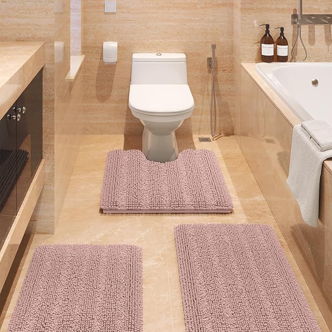 - LUXURY 3 PIECE BATHROOM RUG: Including 1 Large Bath Rug 20"x32", 1 U-Shape Contoured Rug 22"x24", 1 Small Bath Rug 17"x24". ACCUMTEK bathroom rug set made of 100% luxurious chenille fabric microfiber with higher pile than others. The thick and soft chenille helps soothe tired feet and keep your toes warm on the cold floor. The high density and plushness of the chenille offers exceptional comfort and support for your feet. You will feel like stepping on a cozy cloud to enjoy the ultimate luxury.