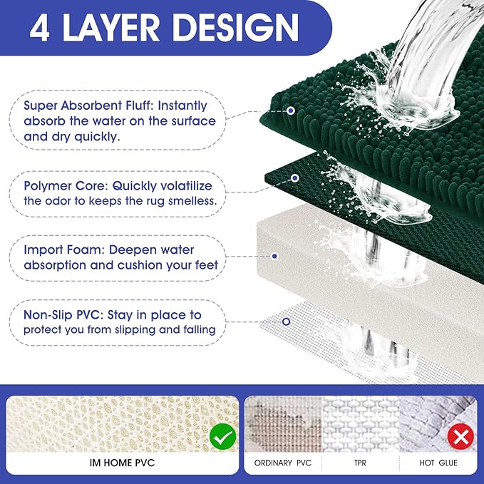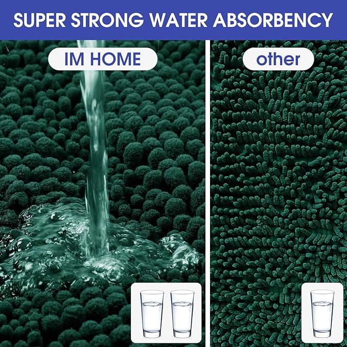 - SUPERIOR ABSORBENCY: The bold pile chenille on the top surface of the luxurious toilet mat soak up a lot of water and keep your floor dry when you're stepping out of the bath, Bathtub, shower, or getting ready by the sink, moisture is trapped in the bathroom rug’s deep pile, to avoid the dripping water disturbing your bathroom's serenity and tidy.