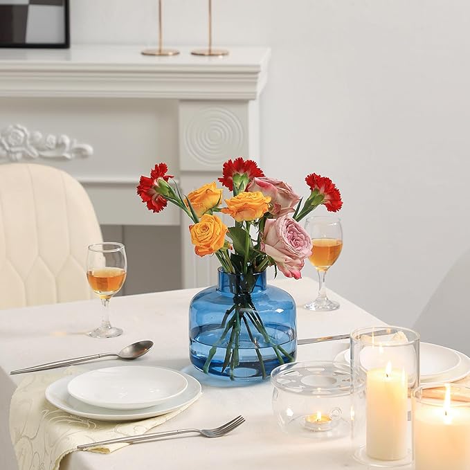 Blue Glass Vase, Short Flower Vase, Round Glass Vases for Flowers, 6 Inch Small Glass Vases for Living Room, Dining Table, Wedding, Bookshelf, Office, Coffee Table