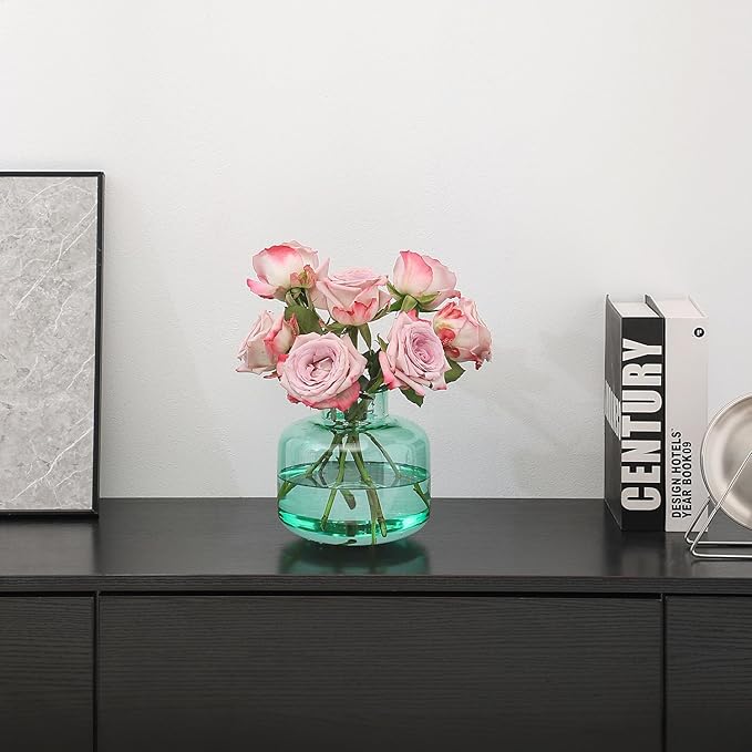 Green Glass Vase, Short Flower Vase, Round Glass Vases for Flowers, 6 Inch Small Glass Vases for Living Room, Dining Table, Wedding, Bookshelf, Office, Coffee Table