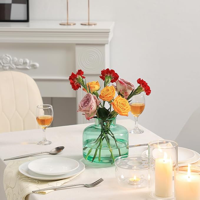 - FLOWER SELECTION: With a small opening, this green glass vase must be paired with short-stemmed flowers, such as roses, tulips, lilies, and gladiolus, to create a wonderful centerpiece