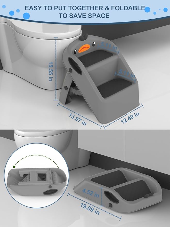- FOLDABLE STEP STOOL FOR KIDS - SPACE SAVING: The upside is that you can fold it up, after folding, the height is 4.5", so take up less space to put it somewhere when you’re not using it. Just open the feet of kids step stool and lock the safety latch to form "A" structure to keep stability. Only takes 30 seconds for assembly to use, and fold for storage.