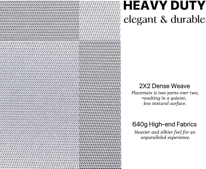 - HEAVY-DUTY:We uses the German-imported higher grammage vinyl material (Specialty PVC)than other placemats on the market,plus the precise,dense weave craftsmanship to give the woven placemats a thicker feel and make the place mats long-lasting.