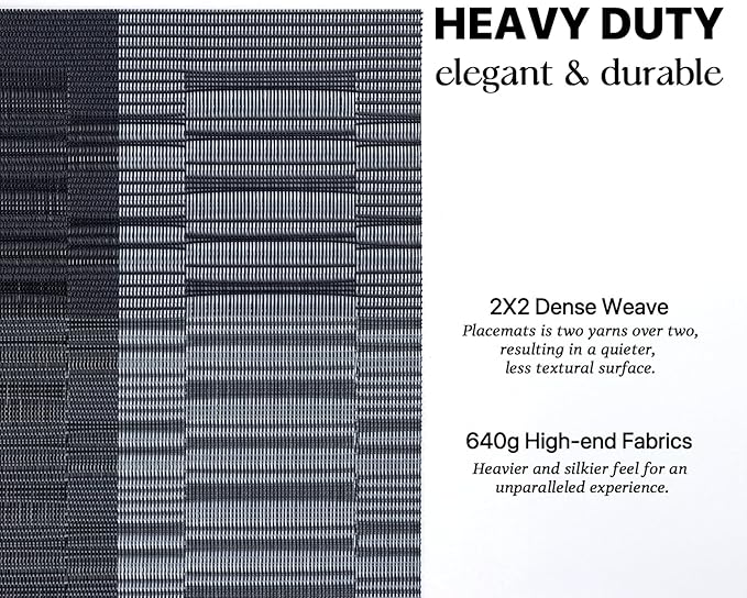 - HEAVY-DUTY:We uses the German-imported higher grammage vinyl material (Specialty PVC)than other placemats on the market,plus the precise,dense weave craftsmanship to give the woven placemats a thicker feel and make the place mats long-lasting.