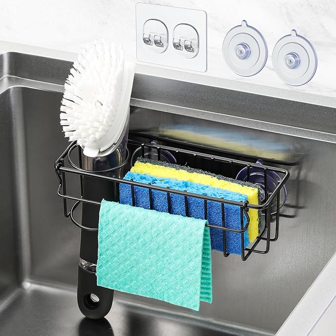 - Multiuse Sink Caddy for Sink - The sink caddy organizer can store sponge, soap, dish brushes, dish towels, sink strainer, sink stopper, scrub and more.The round hole is the perfect size for dish brush that put in and take out. The towel hanging rack is easy for hanging and pulling out dish cloth.