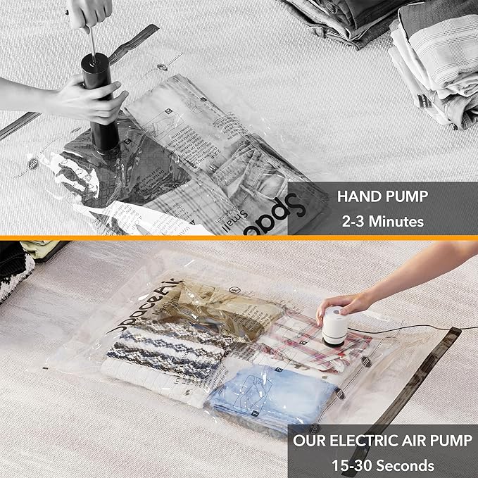 - Electric Air Pump for Fast Vacuum: Come with an Electric Air Pump, unlike the hand pump, it is much easier and faster to suck the air out of the vacuum bags, you don't need to use your strength to pull and push the pump again and again to take the air out of the bags.