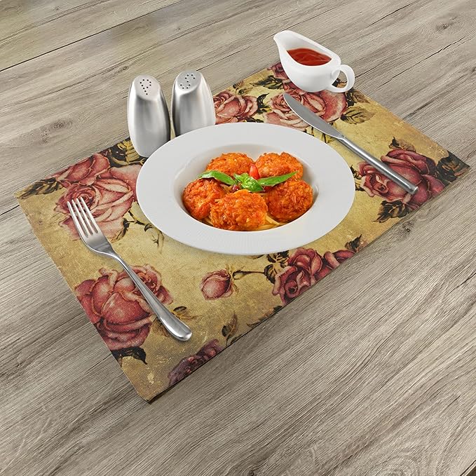 Ambesonne Rose Place Mats Set of 8, Old Fashioned Victorian Style Pattern Dramatic Color Bohemian Art Design, Washable Fabric Placemats for Dining Table, Placemat 8 pcs, Mustard Pink