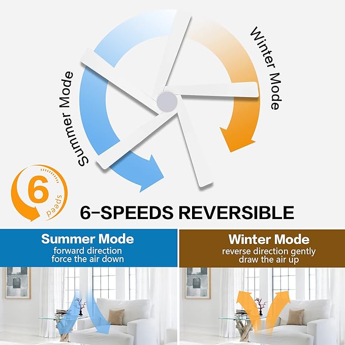 - 6 SPEEDS DUAL-DIRECTION FAN: The powerful ceiling fan operates on 6 forward and reverse speeds (easy to adjust with the included handheld remote). Its quiet, reversible motor allows it to turn your room into an oasis in summer as well as warming you up during winter.
