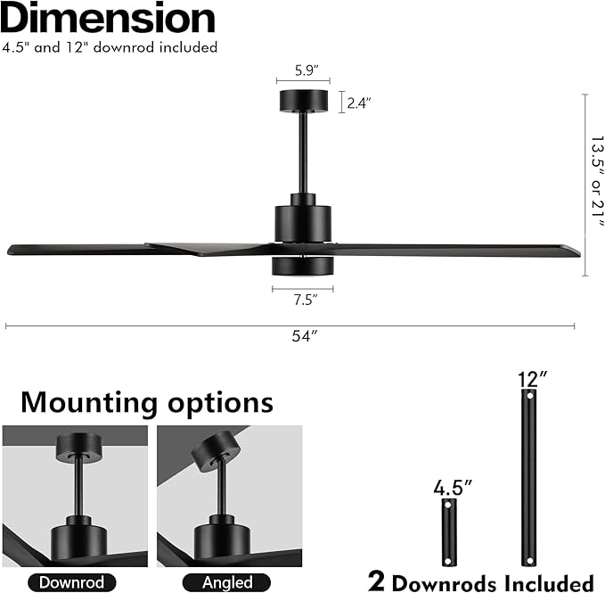 - MADE FOR ANY SPACE: The 54-inch blade span makes this ceiling fan perfect for spaces like living rooms, bedrooms or larger rooms (suitable for damp places). 2 down rods (4.5” and 12” long) are included to match different ceiling heights.