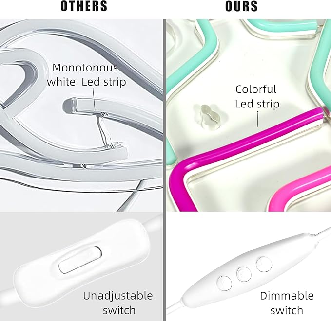 - Adjustable Brightness. The neon light sign has a 6-speed brightness dimmer from 10% to 100%. Choosing your preferred brightness according to the usage scenario meets the needs of various scenarios and makes life more colorful.