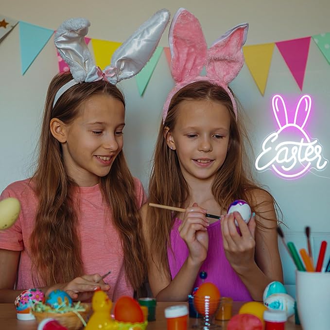- Easter Day Decor: Bunny Easter egg neon signs are suitable for kids' room, living room, Easter Day party, bar, shops decoration. Pink rabbit ear neon LED signs could be for birthday, Easter Day gifts to families, rabbit lovers, girlfriend, girls, kids.