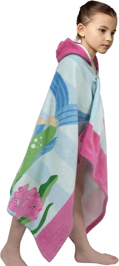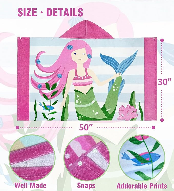 Kids Bath Towel Hooded - Cotton Kids Beach Towel 30"x50" for Ages 3 to 10, Toddler Towels with Hood Snaps, Soft Terry Poncho Towel as Pool Swim Cover Ups for Girls Boys (Mermaid Pink)